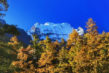 冰晶潔白的央邁勇傲立于天地之間,直指云霄,氣勢(shì)磅礴,讓人肅然起敬。山下,寬闊的峽谷像一條玉帶,環(huán)繞著神山,郁蔥的深林,野花盛開的草地、潺潺的溪流在雪山腳下映襯著壯觀的山峰。
