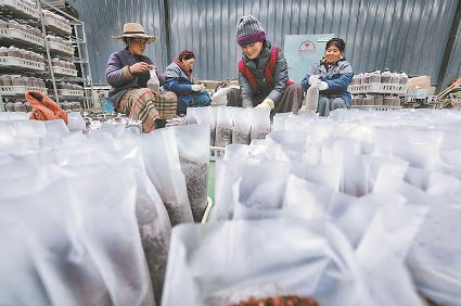 還有村民進(jìn)了產(chǎn)業(yè)園務(wù)工。帕他志瑪、扎西翁姆、白瑪、確志、斯郎卓呷都在產(chǎn)業(yè)園務(wù)工,月平均收入可達(dá)3000元以上。在八角樓鄉(xiāng),像帕他志瑪這樣在“家門口”打工、全家人掙錢的當(dāng)?shù)卮迕窦彝ゲ辉谏贁?shù)。40多位村民在產(chǎn)業(yè)園長(zhǎng)期就業(yè),100多位村民參與產(chǎn)業(yè)園的季節(jié)性就業(yè),這都帶動(dòng)了松茸村、木澤西村、維地村的貧困群眾實(shí)現(xiàn)高質(zhì)量脫貧?,F(xiàn)代立體高效食用菌產(chǎn)業(yè)的建立讓當(dāng)?shù)卮迕竦谝淮螄L到了一天掙上百塊錢的甜頭。