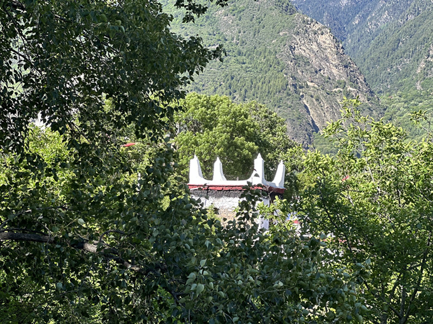 繼續(xù)朝寨子深處走去,一片青稞地邊放著一個竹背簍,里面裝著大半背簍嫩羊草。地里有人在躬身除草,聽到我們經(jīng)過,她直起身來看,原來是一位眉目清秀的嘉絨阿婆。姑娘用方言對她說:“這一行人是來采集嘉絨民情風(fēng)俗的作家。”阿婆喜悅地朝我們行合掌禮,并不住地說著歡迎的話。我們的停留,沒有打擾到她放下手里的那把羊草來迎接,這是我見到過最得體的事情。