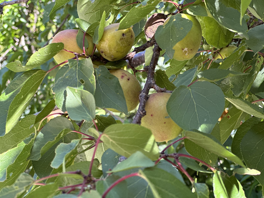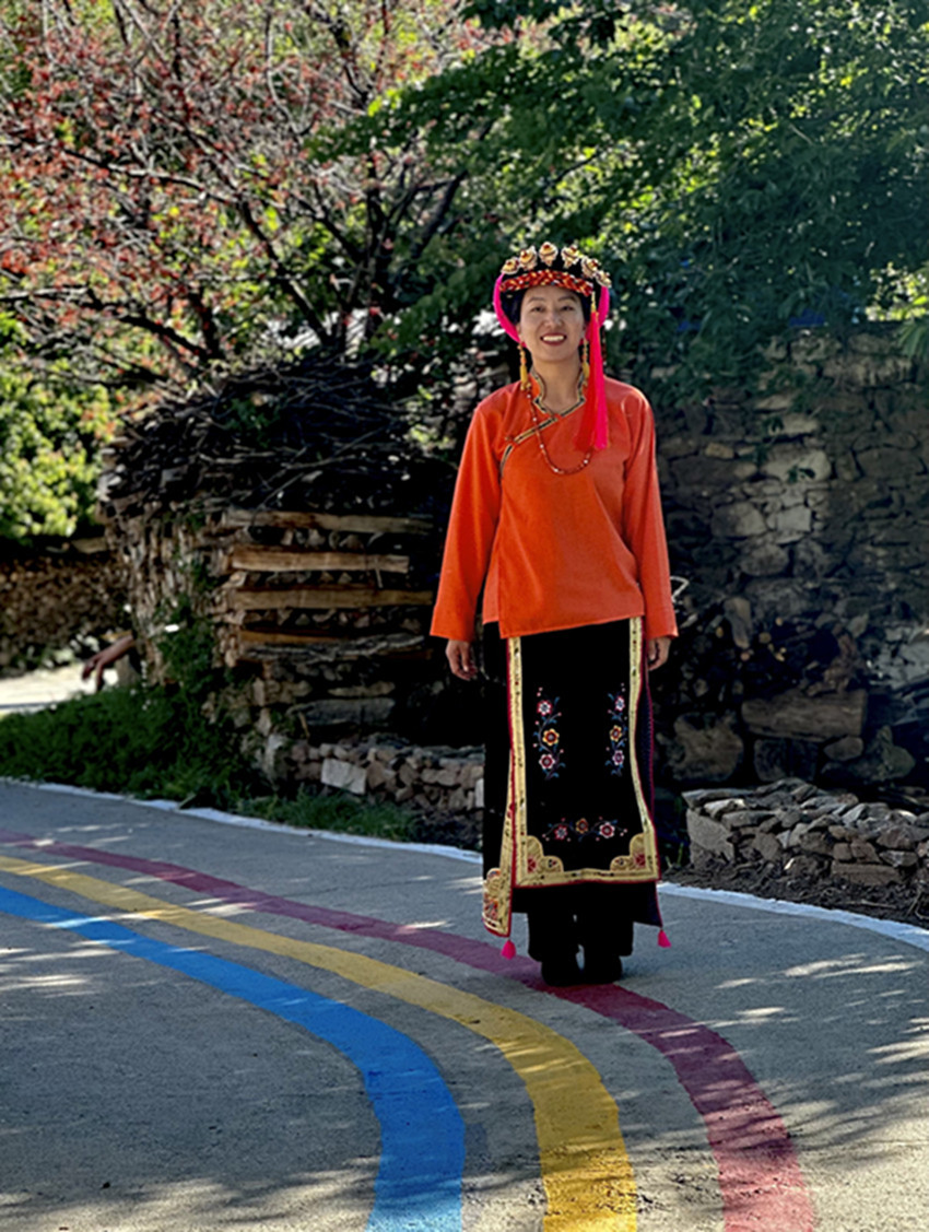 彩色鋪裝的通村路兩邊,成片的苞谷林正在背紅纓,風(fēng)中響著緊密結(jié)實的聲音。各種果木枝繁葉茂,結(jié)滿了寶石般紅紅綠綠的果子。一排柴垛上方,伸出很大一片橙色的小果子,沒有葉子,我們像賞花一樣欣喜于它的紅艷。嘉絨姑娘悄默地走在我們身邊,她的手里擺弄著一片草葉,安靜而美好,是感到這一路上的莊稼果木已經(jīng)足夠繁盛。