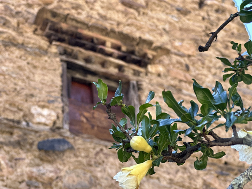 聽著嘉絨姑娘細(xì)柔地說話聲,我們已經(jīng)走到了下寨子的坡路上。在路的轉(zhuǎn)角處,我回望老人,她背上那背簍羊草朝路邊上開滿白花的藏房走去,她漸漸消失在花地里的背影是如我這般回望者的心靈家園。