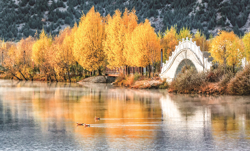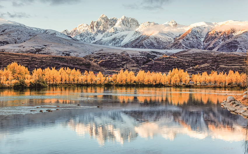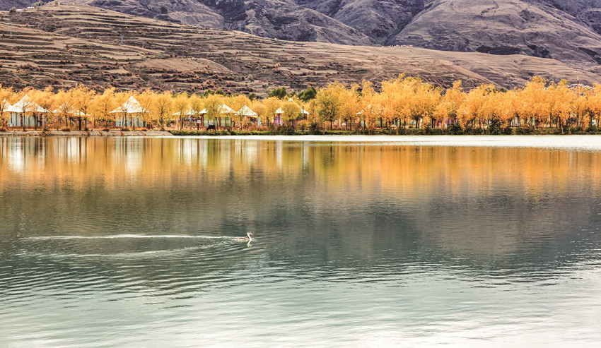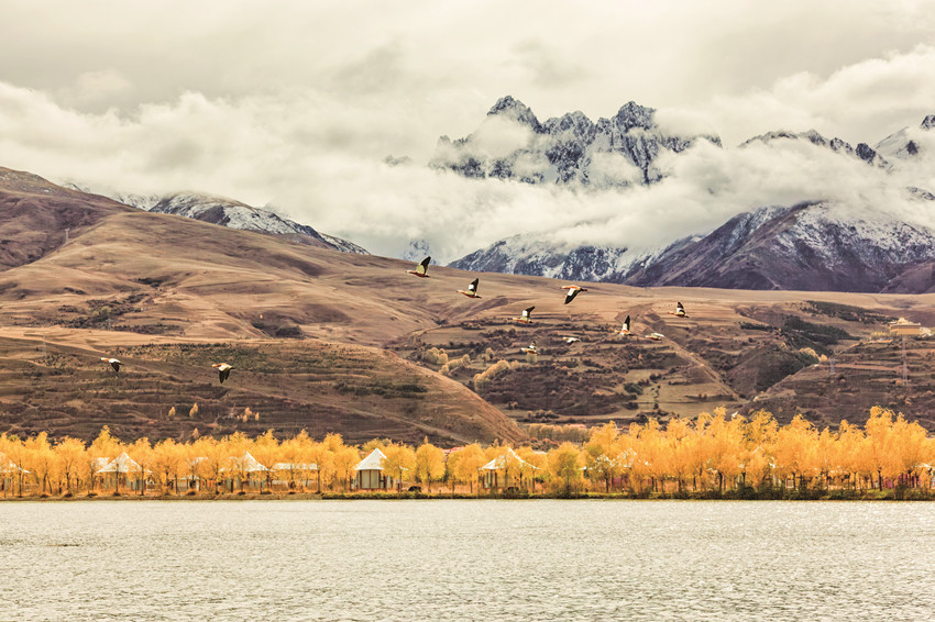 除了巍峨的雪山與彩林作伴,不少越冬的候鳥(niǎo)也飛抵珠牡湖。金色彩林倒映在清澈如鏡的湖面上,不時(shí)有候鳥(niǎo)游過(guò),激起層層漣漪,為珠牡湖增添了不少生機(jī)與趣味。