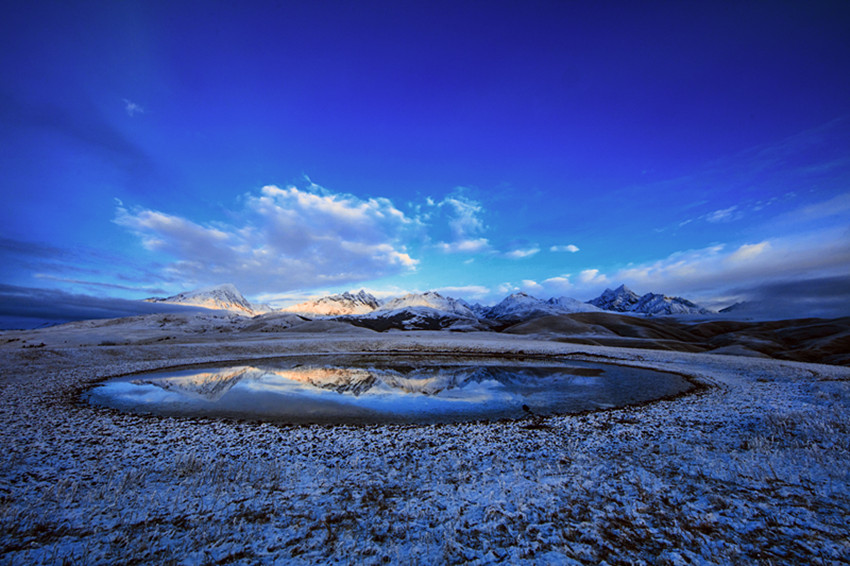 延綿山坡白雪皚皚,格聶神山與雪風(fēng)纏綿,理塘與巴塘相接處的姊妹湖凝結(jié)成藍(lán)冰。