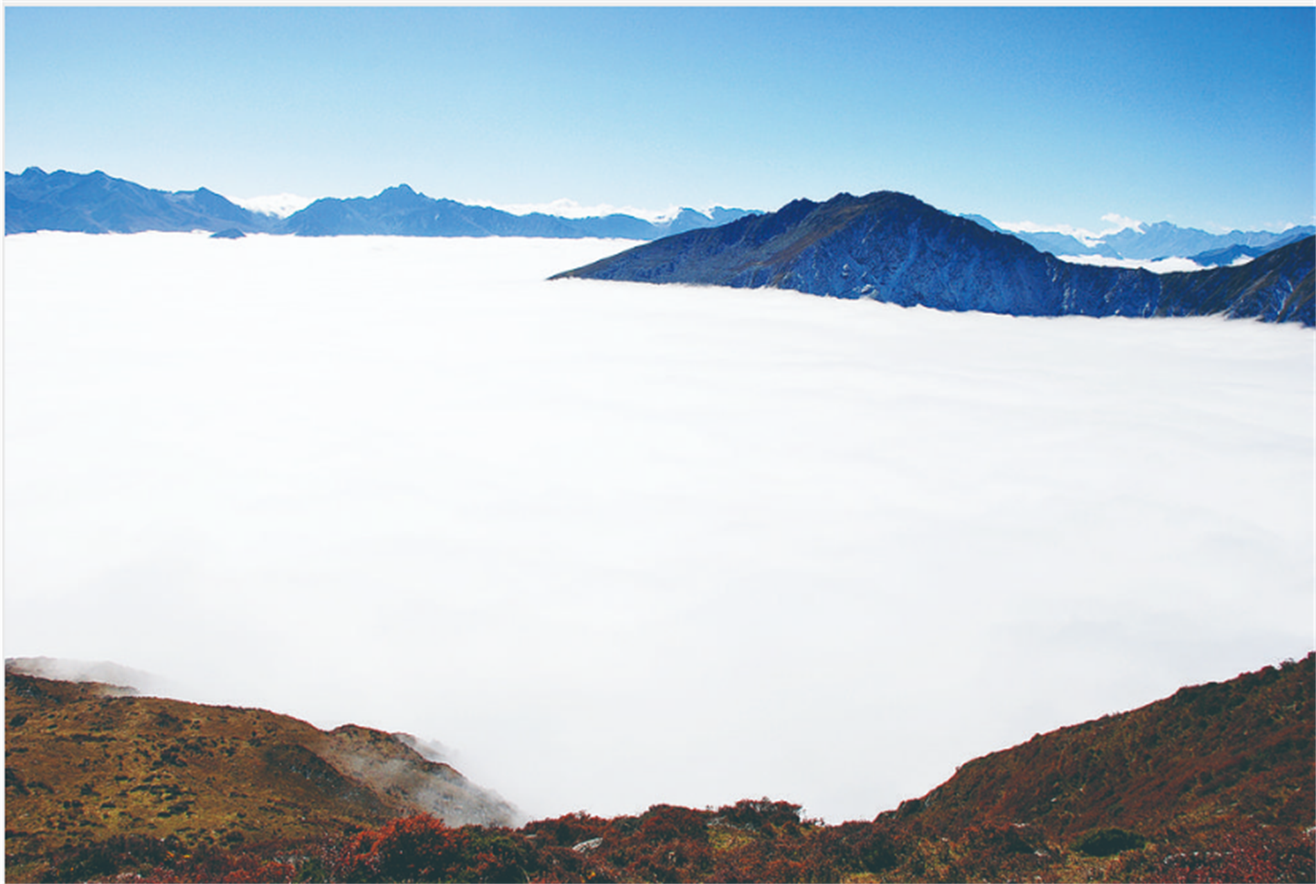 秋日,灌木林樹葉散落,令牌山下的云海連綿起伏,與群山相互交織,霞光散落云島,普照千里之外,峽谷里的山村染成一幅水墨畫,遠眺貢嘎南坡,呈現(xiàn)“日照金山”。