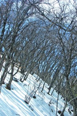 在馬鞍山頂?shù)谋泵婕氨逼?,有一片望不到邊際的樹林。冬天的這片樹林,呈成熟而貴氣的暗褐色,葉落枝出,紛亂、素凈、蕭瑟、清貴。于是,以雪地和樹林作背景,也照了不少相。