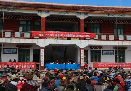 在此次宣講活動中,我州建立了州、縣、鄉(xiāng)、村“四級”宣講網(wǎng)絡(luò),將群眾宣傳教育與群眾工作全覆蓋、法治甘孜、創(chuàng)建全國民族團(tuán)結(jié)進(jìn)步示范州等活動有機(jī)結(jié)合,突出主題宣講,注重特色宣講和典型宣講,創(chuàng)造性地啟用了“草根宣講員”以及面對面“1+N”宣講,派會當(dāng)?shù)卣Z言的宣講老師進(jìn)行宣講,形成了層次分明、重點突出的立體宣講體系,實現(xiàn)了從剛性宣教向柔性宣教、從說教向寓教、從蜻蜓點水向潛入內(nèi)心的“三個轉(zhuǎn)變”。