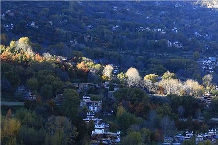 落日將最后一道霞光在山尖劃過,暗夜便裹挾這寒意搖動(dòng)起山林中的樹木。風(fēng)漸緊,那已經(jīng)稀稀落落的樹葉隨著風(fēng)的韻律,跳起歡快的鍋莊,仿佛在告別這一年的繁華。突如其來的大雪,給丹巴的二月涂上白色的記號(hào)。從山尖到院前的樹上,一溜兒雪白,正應(yīng)了“忽如一夜春風(fēng)來,千樹萬樹梨花開”的情景,讓人忍不住伸出手指看看這花是真是假。大雪過后,陽光如約而至撒滿藏寨,金色陽光和蒸騰的白霧縈繞在雪白的山頭,與山下的古碉藏寨,河畔的清流巧妙地構(gòu)成一幅絕美畫卷,讓人仿佛身處仙境。吸足了養(yǎng)分的柳樹終于抽出綠芽送來春天的信號(hào),那柳條兒在細(xì)風(fēng)吹拂下宛如少女對鏡梳妝,在陽光下顯得無比溫柔,讓人不禁想貼近它們,感受這溫暖又靜謐的溫柔。