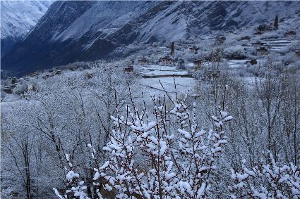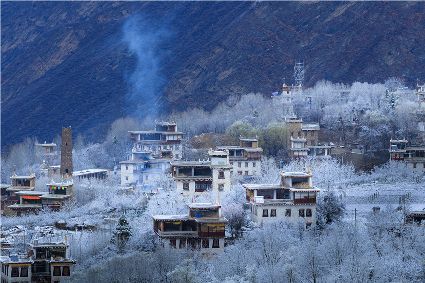我以這份孤獨和執(zhí)著,爬上了東邊的山坡。雪停了,微風習習。櫻桃花、桃花在雪枝頭冷艷,淡淡的幽香徐徐浸入心扉。滿眼望去,一片晶瑩,一片潔白。古碉藏寨在這片世界里,寧靜安詳,不容一絲一毫的驚擾。我懷疑自己進入了那種叫做空靈的境界。