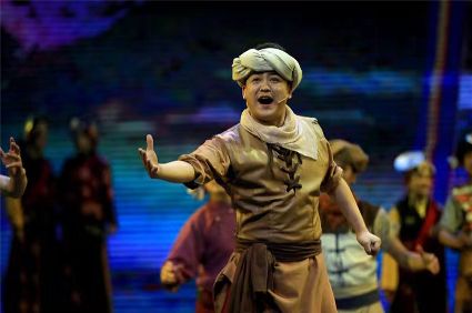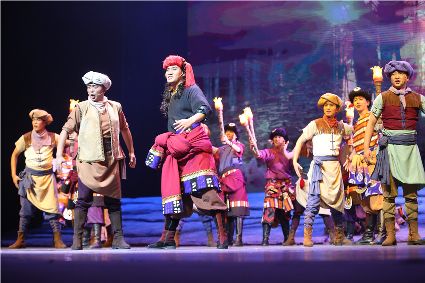初生的音樂劇《康定情歌》是個聽話謙遜的孩童,專業(yè)人士的諄諄教誨一定會牢記在心;他也是個具有思鄉(xiāng)情結(jié)的游子,自己的一顰一笑都流露出濃郁的民族風(fēng)采;同時他也是個頑強(qiáng)拼搏的逐夢少年,即便汗水和淚水匯成一道道溝壑,依然挺胸不低頭,只為在明天,成為更好的自己。 (圖片由州歌舞團(tuán)提供)