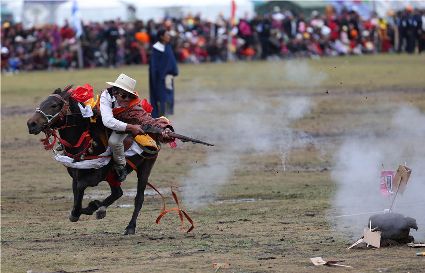 牧民在表演馬上射擊。