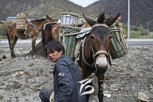 白玉縣,拉沙石的馬幫。