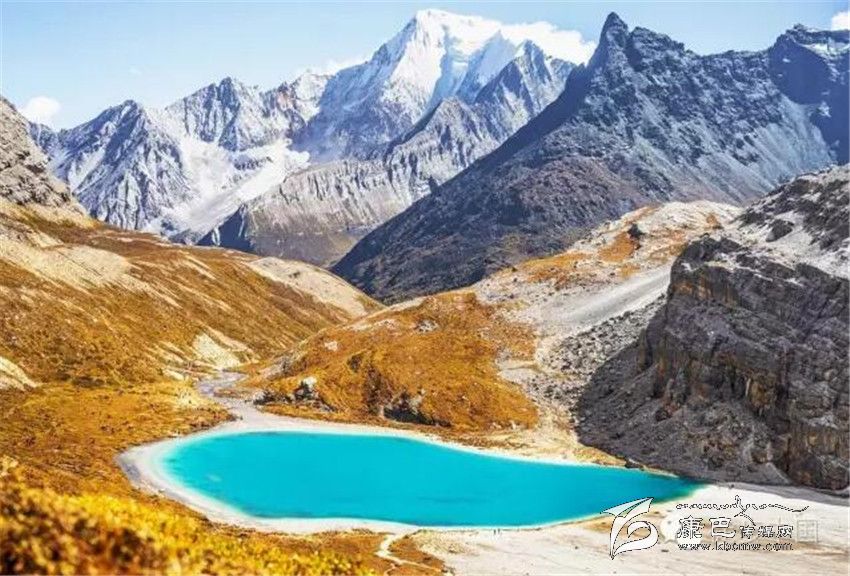 三神山中間的牛奶海,美麗的高原堰塞湖,面積0.5公頃,海拔4500米,四周雪山環(huán)繞,湖水清瑩碧藍(lán),山上成瀑,以其玲瓏秀雅水色翠藍(lán)而著名,牛奶海上方有大片的冰川。傳說每年春暖花開之時(shí),湖水會(huì)像牛奶一樣潔白如瓊漿,并因此得名牛奶海。