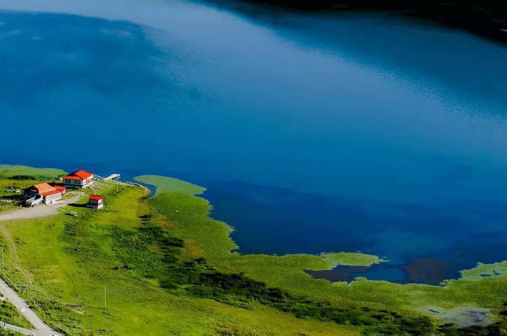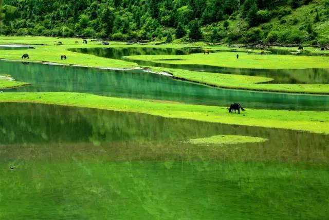 被原始森林和草甸環(huán)抱的五須海,當(dāng)?shù)厝擞鳛椤跋膳釆y的明鏡”,湖水碧綠透亮,將周圍的山水和天空全映照在湖面,幽靜的像一幅畫。從夏到秋周圍百花盛開,古樹盤根錯(cuò)節(jié)、藤枝攀沿纏繞,杜鵑樹伸向湖面,仿佛進(jìn)入原始古樸的仙境。