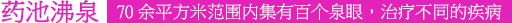 稱為藥泉的沸泉群水溫高達(dá)90℃,含有多種對人體有益的元素,不同的泉眼(如明目泉、健胃泉、洗腳泉等),分別對治療眼疾、胃病、風(fēng)濕等病癥具有不同的療效。