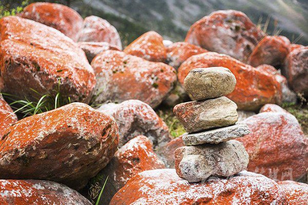 紅石灘的神奇之處并非因為石塊因為富含某種元素而呈現(xiàn)紅色,而是附著在石頭表面的紅色苔蘚。這種苔蘚據(jù)說只生長在海拔3000米之上的地方。