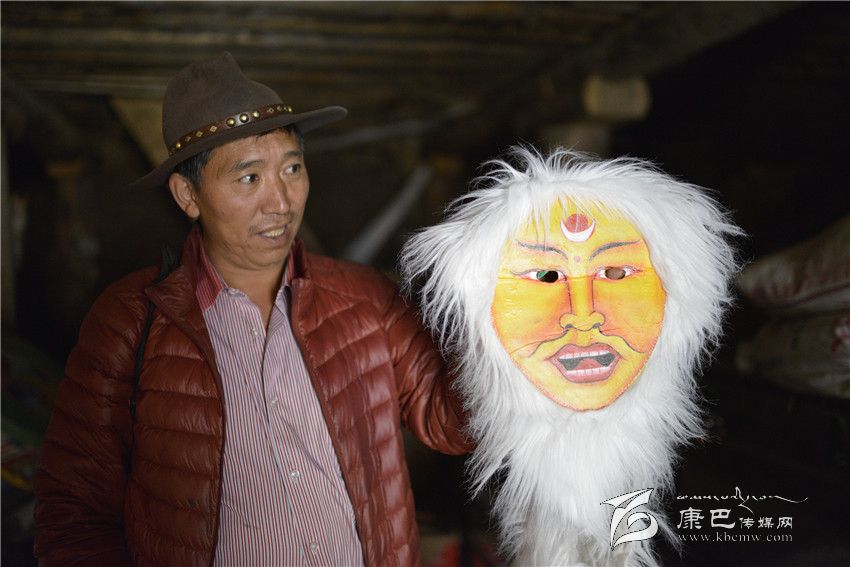 午飯后,洛絨丹巴帶我到離家不遠(yuǎn)的一個(gè)小院,推開(kāi)底樓嘎吱作響的木門(mén),借助外面的光亮,看見(jiàn)有幾個(gè)巨大的鐵皮箱。洛絨丹巴打開(kāi)一口箱子,不想里面整齊地放著各種戲服;第二口箱子是頭飾,唐朝文成公主的、清朝皇帝的。這些服裝和頭飾多是模仿電視電影,或者加上想象自己制作的,個(gè)別是外地方買(mǎi)回的。最具特色是第三口箱子,用牛皮制作的各種面具、表情十分夸張,有和善的、猙獰的、威風(fēng)的,神情各異。面具的顏色各種各樣,白色、黑色、黃色、紅色等。眼睛和嘴巴處挖了窟窿,有的還在面具外圍綴了一圈羊毛。洛絨丹巴指點(diǎn)著各種顏色的面具介紹:白色代表純潔、紅色代表威嚴(yán)、黃色代表吉祥;巫女則半黑半白,象征其兩面三刀的性格;青面獠牙代表妖魔。說(shuō)起這些他如數(shù)家珍。