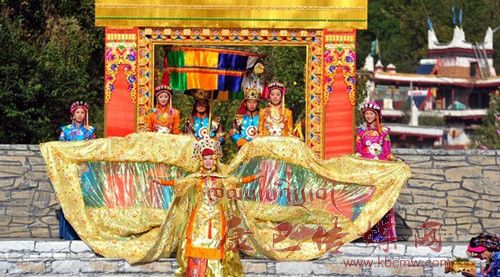 在催人奮進(jìn)的戰(zhàn)鼓聲中,一群身披甲胄的士兵拿著長劍,背著巨弓走到臺前,在鏗鏘的戰(zhàn)鼓聲中,戰(zhàn)士們做著各種競技動(dòng)作,模仿武士們互相攻擊的樣子,那矯健的身影展示了遠(yuǎn)古時(shí)代嘉絨藏族先民們?yōu)榱松媾c自然努力抗?fàn)幍膱鼍?。過了一會(huì)兒音樂一轉(zhuǎn),戰(zhàn)鼓聲漸漸減弱,在鳥雀的陣陣啾啾聲中,一座木門慢慢的開啟,一位身披長袍、頭戴鳳冠的女王在眾多美女的簇?fù)硐?,緩緩走下臺階步入舞臺中央,此時(shí),一位手捧托盤的老者來到女王面前單膝下跪,將托盤高舉過頂,并邀請女王品嘗佳肴,女王將中指在酒中蘸了蘸,并曲起中指向四周輕輕彈去,寓意愿將杯中美酒與四方百姓同飲。在女王面前還放置著一個(gè)凈水桶,桶中盛滿了清澈的甘泉,桶上橫放著一枝柏樹枝,女王伸出纖纖玉手,拿著柏樹枝在水中蘸了蘸,面向墨爾多神山撒去,寓意向神山祈福。這是此次《美人谷·丹巴》節(jié)目展演中的序曲部分,有著強(qiáng)烈的東女神韻,將遠(yuǎn)古時(shí)代東女國女王遺風(fēng)展演的淋漓盡致。