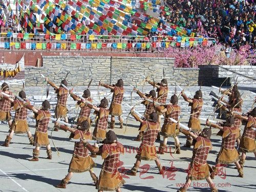 10月26日,在甲居藏寨,處處洋溢著豐收和歡樂的氣氛,人們扶老攜幼,身著節(jié)日的盛裝走到一起,來共同慶祝丹巴嘉絨風(fēng)情節(jié)的順利召開。在一塊空地中,搭建了臨時(shí)的舞臺,看臺上,幾座古碉模型傲然挺立,在不遠(yuǎn)處,一座古碉矗立在一座小山包上,與古碉模型遙相呼應(yīng)、相映成趣。上午9時(shí)40分,當(dāng)節(jié)目主持人宣布嘉絨風(fēng)情節(jié)正式開始時(shí),一束束搖曳的煙花向空中飛去,在空中炸響后,散發(fā)出五顏六色的煙霧,其中有的還幻化成幾多小小的降落傘,就像多多盛開的鮮花在空中綻放。演出現(xiàn)場前的大地和遠(yuǎn)處的小山坡上到處都站滿了熱情的觀眾,合著禮花的爆裂時(shí)的響聲,將手中的小紅旗展開,高舉過頭頂,有節(jié)奏的左右搖動(dòng),霎時(shí)間,整個(gè)現(xiàn)場成為了紅色的海洋。