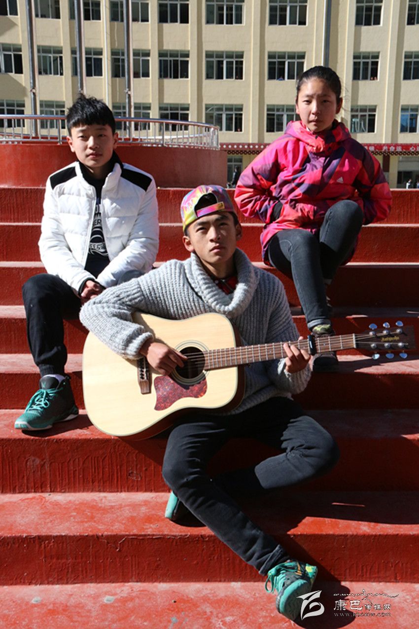 “白云下一座溜溜的城/聽著溜溜的歌聲/李家那溜溜的大姐喲/溜溜愛上藏家大哥喲/尋夢在溜溜的跑馬山/我推著金桶溜溜轉(zhuǎn)/折多河溜溜穿城過喲/頌經(jīng)聲溜溜的傳承喲/悠揚琴聲在溜溜小城/我溜溜等待著愛人/跑馬山龍打溜溜撒喲/心就在溜溜城中活……”最近一首名叫《溜溜》的歌曲刷爆了記者的朋友圈,不到一天的時間點擊率達到12000多,干凈的嗓音碰上吉他、貝斯等流行元素,給聽眾帶了一種不同的音樂享受。《溜溜》的詞曲作者周麒(當(dāng)然他也是原唱之一)和主唱昂汪央金拉姆、周楠都是來自康定中學(xué)的學(xué)生,在冬日的午后,記者在康定中學(xué)的籃球場見到了這三位一臉天真的原創(chuàng)者。初見記者,他們還有一些靦腆、緊張,但是一談到音樂,他們立刻有了說不完的話。