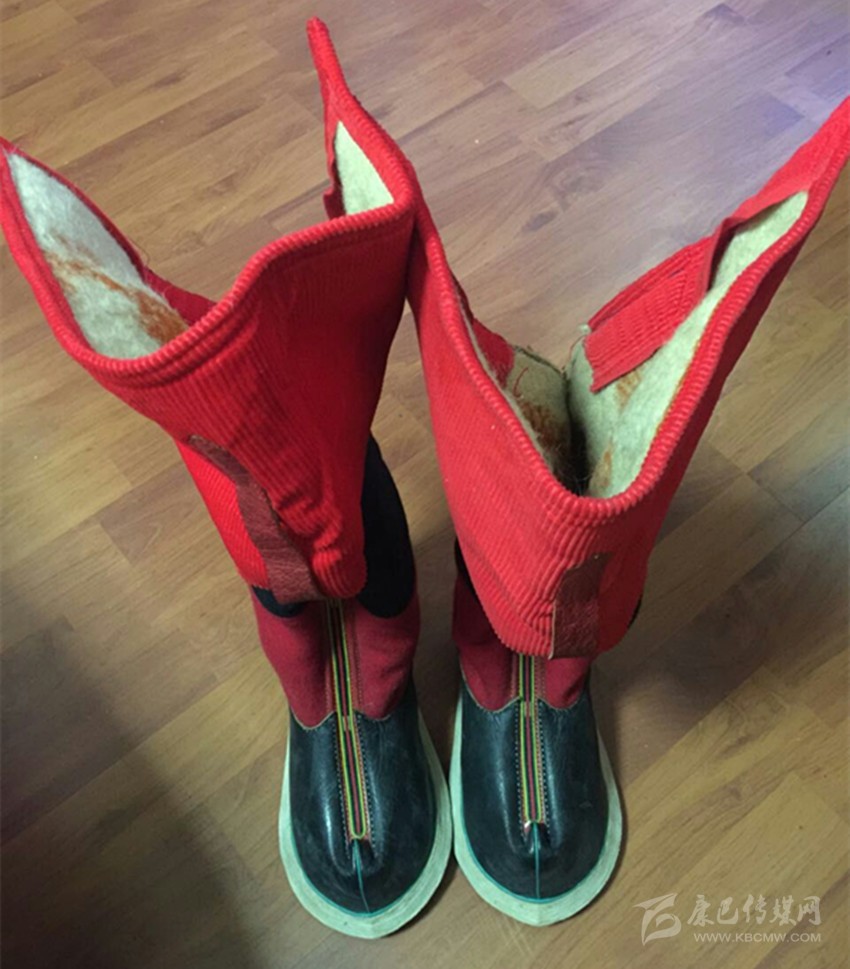 藏靴,是藏民不可缺少的用品,靴子的原料為牛皮,用較厚的牛皮作底,薄一點(diǎn)的作面,底和面的縫合則用牛羊皮條,鞋口前端還有帶毛的牛羊皮裝飾。從外觀上看類(lèi)似舞臺(tái)上古裝戲里將相穿的靴子,靴子內(nèi)里有毛絨,既暖和又舒適,鞋腰還配有由氆氌等原料制成的各類(lèi)樣式的線條、花紋。