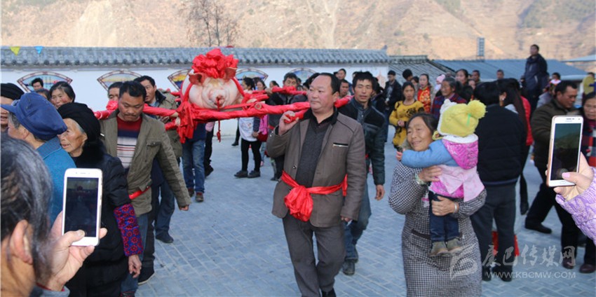 5個(gè)村民將年豬抬到秤上。360斤。村民為年豬準(zhǔn)備大紅花。準(zhǔn)備紙錢、香蠟。9點(diǎn)整,殺豬匠開始了他的工作,在眾人齊心協(xié)力下,光溜溜的年豬被打整干凈?!氨S游覀兇鍋砟觑L(fēng)調(diào)雨順、五谷豐登,村民平安健康。”村中老者敬過天地后,8個(gè)身強(qiáng)力壯的村民站在年豬旁,豎著拇指齊聲說,今年家家戶戶還要養(yǎng)大肥豬。抬著年豬,村里的中老年人簇?fù)碇咴谧钋懊?,唱著悅耳的民謠,大意是歌唱幸福生活的,迎著2018年的第一縷陽光,村民們喜氣洋洋。到村里來的游客蜂擁拍照。