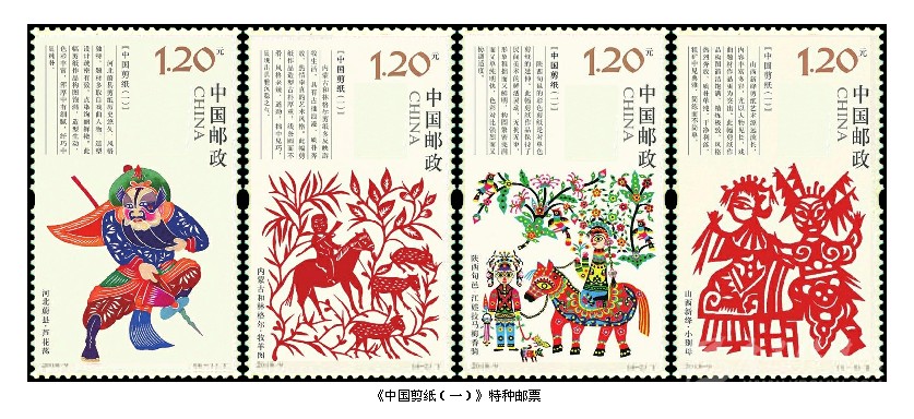 2018年1月24日,中國郵政發(fā)行《中國剪紙(第一組)》特種郵票,全套4枚。這是中國郵政繼1959年1月1日發(fā)行的《剪紙》特種郵票59年后重新發(fā)行的《中國剪紙》系列郵票。全系列郵票計劃發(fā)行4組,每組4枚。這次發(fā)行的第一組4枚郵票入選內(nèi)容分別是被列入第一批國家級非物質(zhì)文化遺產(chǎn)名錄的北方四處剪紙傳承人的作品:第一枚“河北蔚縣·蘆花蕩”,河北蔚縣剪紙歷史悠久,風(fēng)格獨(dú)特,題材多取自于人物,造型設(shè)計疏密有致,點染絢麗鮮艷。此幅作品作者王老賞(1890-1951),河北省蔚縣南張莊村人;第二枚“內(nèi)蒙和林格爾·牧羊圖”,內(nèi)蒙古和林格爾剪紙多反映游牧生活,具有古拙浪漫、質(zhì)樸奔放、熱情率真的藝術(shù)風(fēng)格。此幅作品作者張花女 (1903-2004),和林格爾縣董家營鄉(xiāng)曹老八夭村人;第三枚“陜西旬邑·江娃拉馬梅香騎”,陜西旬邑的彩色剪紙具有民間美術(shù)的鮮活靈動,無拘無束,形象稚拙而又鮮明,構(gòu)圖緊密完滿而又單純明快,色彩對比強(qiáng)烈而又協(xié)調(diào)適度。此幅作品作者庫淑蘭(1920-2004),陜西咸陽市旬邑縣張洪鎮(zhèn)赤道鄉(xiāng)富村人;第四枚“山西新絳·小別母”,山西新絳剪紙藝術(shù)源遠(yuǎn)流長,內(nèi)容豐富多彩,尤以人物見長,戲曲題材作品更為突出,構(gòu)圖簡潔飽滿、精煉極致,粗獷中見典雅,簡煉而不簡單。此幅作品作者蘇蘭花(1906-1995),山西運(yùn)城市新絳縣澤掌鎮(zhèn)北蘇村人。