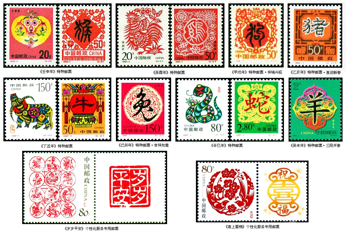 剪紙作為藝術(shù)百花園中的一朵奇葩,在我國郵票圖案設(shè)計中應(yīng)用也非常廣泛。由于傳統(tǒng)的民間剪紙有著濃郁的吉祥喜慶氣氛,因此在我國近些年發(fā)行的生肖郵票中多次出現(xiàn)剪紙藝術(shù)。在第二輪12套24枚生肖郵票中的剪紙圖案分別有1992年《壬申年》的“猴桃獻(xiàn)瑞”和“喜鵲登梅”、1993年《癸酉年》的“雄雞報曉”和“四季吉祥”、1994年《甲戌年》的第二枚“祥瑞興旺”、1995年的《乙亥年》的第二枚“喜迎新春”、1997年的《丁丑年》的“金牛奮蹄”和“牛耕年豐”、1999年《己卯年》的第二枚“吉祥如意”、 2001年《辛巳年》的“祥蛇祝?!焙汀跋檫\(yùn)普照”以及2003年的《癸未年》第二枚“三陽開泰”等。這些郵票中剪紙圖案有的直接取材于民間,有的則是在原作基礎(chǔ)上再創(chuàng)作。如“雄雞報曉”一枚,圖案選用的是河北省獻(xiàn)縣本齋鄉(xiāng)鄧家莊蔡蘭英老人的剪紙“百雞圖”中的一幅,而“金牛奮蹄”一枚,圖案是根據(jù)山東高密民間藝人齊秀花的剪紙“媳婦騎?!痹偌庸?chuàng)作而成的。在我國發(fā)行的祝福系列個性化服務(wù)專用郵票中也有吉祥喜慶的剪紙圖案,即2005年11月6日的《歲歲平安》和2005年11月11日的《喜上眉梢》等。