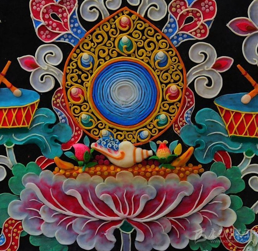 有傳說稱641年文成公主進(jìn)藏,帶去一尊釋迦牟尼12歲等身像并將其供奉于拉薩的大昭寺,當(dāng)?shù)厝罕娪盟钟妥龀苫ü┇I(xiàn)于佛前,以示崇敬之心,后各藏傳佛教寺院相繼使用,視為禮佛珍品,獻(xiàn)酥油花遂成為正月祈愿大法會(huì)的重要內(nèi)容。在發(fā)展過程中,酥油花的塑造方式、花色品種、內(nèi)容題材和工藝技巧都不斷發(fā)生著變化。