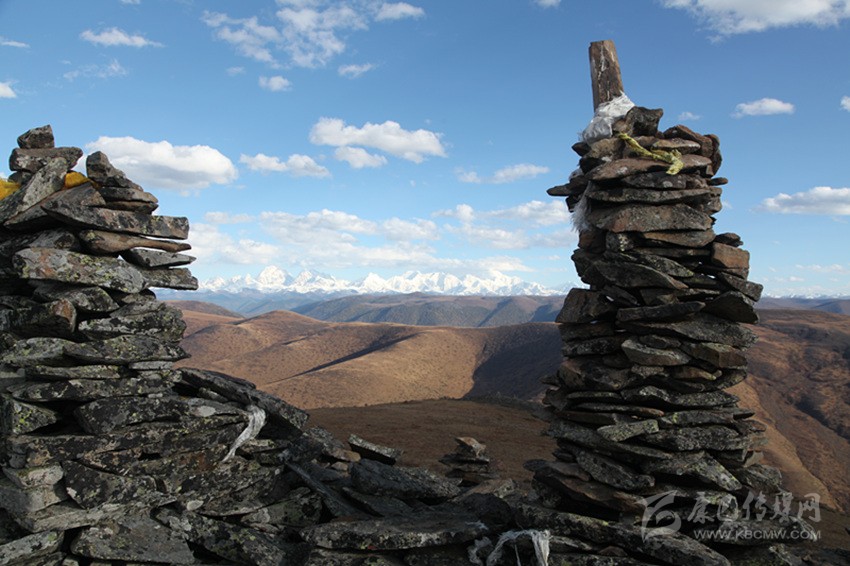在高爾寺山頂,一個標注有海拔4412米的藍底標志牌顯得有些孤單,與之相伴的,除了呼嘯的大風外,還有隨風飄動的嘛呢旗。頭頂?shù)乃{天沒有一朵云彩,遠處的雪山格外潔白耀眼,曾經繁茂的小草已經枯黃了,幾朵不知名的野花在寒風中書寫著最后的輝煌,仿佛在向人們宣誓著它的存在。