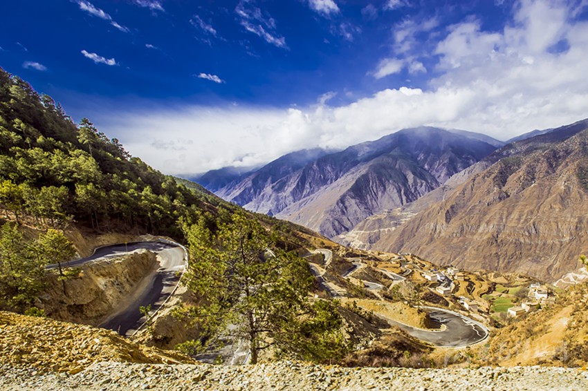 如今,所有鄉(xiāng)村通了硬化路,橫跨在金沙江上的十余座跨江大橋氣貫如虹,天塹變通途。過去我們下鄉(xiāng)時,從日雨到曲雅貢,只有一條從因都壩背后的半山腰路。蒼茫大山,路上幾乎看不見一顆大樹,也找不到一滴水源。從山腰看江畔的因都壩,只有兩戶人家,幾株綠樹總令焦渴難耐的我們望“綠”興嘆!下山走到金沙江邊,熾烈陽光從河灘上反射,火辣辣照在臉龐和皮膚,熱浪令人窒息,感覺目的地遙不可及。現(xiàn)今,干部下村完全不需要走路,走路下鄉(xiāng)對年輕人來說簡直不可思議。公路像一條飄帶環(huán)繞山間,使散落在峽谷中的村寨愈發(fā)展現(xiàn)出欣欣向榮的新風(fēng)貌。