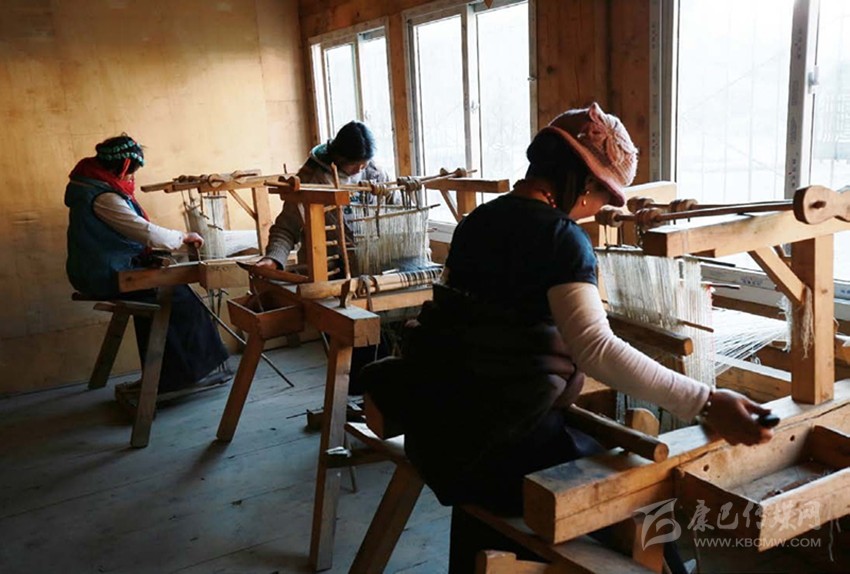 2003年,“編織班”邀請澤巴姆為老師,將這項技藝傳承了下來。現(xiàn)在,澤巴姆年紀(jì)大了,牛羊毛絨編織這樣繁復(fù)又耗體力的事情她不再做了,全交給了自己的媳婦扎西巴姆——當(dāng)?shù)匚ㄒ坏呐Q蚪q編織老師。第二天,我們在編織班的工坊里見到了扎西巴姆。工坊一角的木架上擺著為數(shù)不多的圍巾、墊毯等產(chǎn)品,窗邊平行擺著六臺織機(jī),扎西巴姆正帶著幾個藏族婦女坐在其間飛梭走線。陽光從窗戶透進(jìn)來,投射在織機(jī)和織女們身上,古老的場景、緩慢的節(jié)奏恍惚把我?guī)Щ亓俗婺傅臅r代。扎西巴姆說,當(dāng)?shù)厝朔Q牦牛絨為