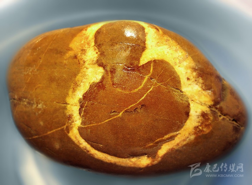 作為一個(gè)無組織的業(yè)余獨(dú)行淘石者,經(jīng)過數(shù)年的摸、淘、琢磨,我悟出:發(fā)掘趣石最重要的是要獨(dú)具慧眼慧心,會(huì)讀石紋。是否讀懂石紋,決定著一塊石頭是頑石還是奇石的命運(yùn)。這是一件很難的事,不僅要運(yùn)用你獨(dú)特的審美視角,還得發(fā)揮你豐富的想象。有時(shí),為了讀懂一些石紋,我會(huì)抱著這塊石頭如考古學(xué)家般仔細(xì)琢磨,從正面、側(cè)面,再到背面,又從左邊旋到右邊,或者上下顛倒來打量……一番冥思苦想,會(huì)意會(huì)神,直到靈感涌起、慧心頓悟,尤如洞天石扉訇然中開,眼前的頑石拙巖,頃刻便化為藝術(shù)珍寶,令我欣喜若狂。正如悉達(dá)多說:“這塊石頭是石頭,它也是動(dòng)物,也是神,也是佛,我敬重它和熱愛它,并非因?yàn)樗谐蝗諘?huì)變成這個(gè)或那個(gè),而是因?yàn)樗缇褪沁@一切,一直是這一切?!背錆M靈性的石頭在你和美妙的自然間搭起了一座通靈的橋梁。淘得趣石,還需緣分。就像人與人的相遇講究緣分,遇到心儀的石頭也講究緣分天助。有年春節(jié),我與父親去河邊轉(zhuǎn)游,面對(duì)涪江寬闊的石灘,我的淘石癮又犯了。但出門前答應(yīng)過父親,這次只逛不撿石頭。我知道老爸心疼我一個(gè)女子大過年的撿石頭。河邊冷,且石頭扛起來很重,手與衣服都會(huì)弄得很臟。我邊陪父親漫走閑聊,眼睛卻止不住往河灘逡巡,仍希望無意中淘到中意的石頭。走著走著,我發(fā)現(xiàn)有一群鳥歡唱著從遠(yuǎn)處一個(gè)石堆飛起,冥冥中感覺那里有寶貝,遂向老爸懇求,過去看一下就回來。來到那個(gè)石堆中心,幾乎不費(fèi)什么功夫,就看到一塊橢圓形石頭上有著一個(gè)自帶金色佛光圈的如來佛半身像。我怔住了,有點(diǎn)不敢相信如此幸運(yùn),蹲在那里久久打量。老爸隨后趕過來,看到佛像石,連連贊嘆了好幾句“太神奇了”。然后,他毫不猶豫地就幫我把石頭搬起來就走?;氐郊抑?,如獲至寶的我,趕緊清洗石頭,在清水的滋潤下,佛像的輪廓更加清晰。頸上的佛珠、袈裟線也分明,細(xì)看令人叫絕的這竟是一尊三面佛:正面、左側(cè)向、右側(cè)向均是佛。而在此石背面,也清晰出現(xiàn)了一個(gè)草書的“吉”字,真令人喜出望外。吉佛石,就這樣神奇地走進(jìn)了我的生活,讓我相信一切緣分都是可遇不可求的。