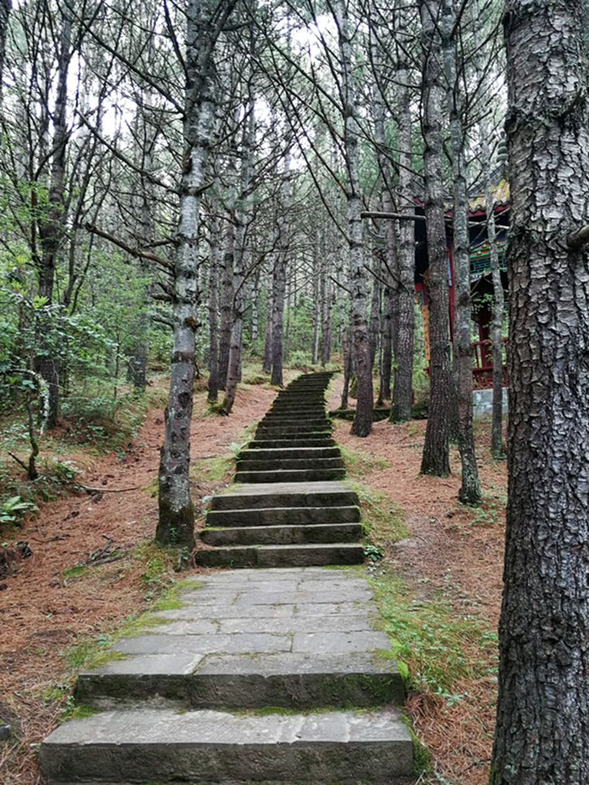 跑馬山腳的國道過境公路康定人都叫它后山公路。在后山公路觀音閣上行百米遠(yuǎn)地方,離公路坎三十公尺遠(yuǎn)近,有一處突兀于山坡樹林的巖頭,晃如一只臥獅探出的頭,那巖頭就是跑馬山獅子巖。此獅子巖自然不是彼獅子巖了。去四道巖的小徑就要從獅子巖傍邊經(jīng)過。那巖頭下如獅子的下頜處人為的砌了一個(gè)土石混合的條狀臺(tái)階,從我記事起就知道上面經(jīng)常供有一些食物瓜果紙張之類的供品。當(dāng)然那時(shí)候我們也常常把花紅、梨子放在那臺(tái)上,以示敬神。但具體敬的什么神靈或土地老仙,我則從未想過,這差不多就是一個(gè)習(xí)俗而已。