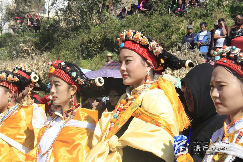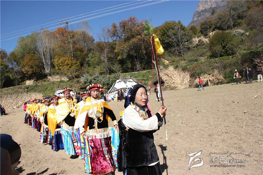 所有的祈福儀式結(jié)束后,村子里一位德高望重的長(zhǎng)輩走上圓臺(tái),用雄渾有力的嗓音向場(chǎng)地外等候的人們發(fā)出指令。在一段念詞結(jié)束之后,參加成人儀式女孩們的父親們?cè)谝晃焕先说闹敢戮従彽南驁?chǎng)地中央走來,老人手舉一幅一米高的唐卡畫,口中念念有詞,走在他后面的父親們一襲白色的毪衫,頭戴一頂灰色的禮帽,腳穿紅黑相間的藏靴,頸上掛著一根潔白的哈達(dá),滿臉肅然的緊隨老人之后,來到月形的臺(tái)子邊,站成一個(gè)半圓形。當(dāng)父親隊(duì)站定后,母親隊(duì)們也向場(chǎng)地中移步而來,本次成人儀式的主角們?cè)谝晃焕习尩膸ьI(lǐng)下向場(chǎng)地中走來,每一位女孩穿著打扮都是那么的光鮮靚麗,每一個(gè)人都顯得美麗動(dòng)人,她們披著黃色的披風(fēng),一根白色的哈達(dá)在胸前打著結(jié),五顏六色的哈達(dá)懸掛在這根哈達(dá)上,在姑娘們的后背迎風(fēng)飄飛。走到圓臺(tái)邊,小女孩們也圍成半圓,低著頭,等待著喇嘛們的念經(jīng)祈福和家人的祈福。此時(shí),兩位吉祥老人站了起來,手中拿著凈瓶,走到姑娘們面前,一邊念誦經(jīng)文,一邊將手中凈瓶里的水倒在姑娘們的手心里,姑娘們則虔誠(chéng)的將這圣水輕輕的抹在自己的額頭上,寓意吉祥如意。待喇嘛主持儀式結(jié)束后,主持儀式的老人用嘉絨語(yǔ)向蒼天和墨爾多神山祈禱,希望神賜予孩子們美麗的面容和美好的心靈,從今日起,她們就可以真正的長(zhǎng)大成人了。吉祥詞念誦完后,母親們排著長(zhǎng)長(zhǎng)的隊(duì)伍緩緩來到孩子們的面前,將懸掛在胸前的哈達(dá)取下,久久的凝視著女兒的臉,眼角掛著幸福的淚水,用顫抖的聲音為女兒祈福,叮囑孩子們要孝敬父母,做一個(gè)正直善良的人,然后,才將白色的哈達(dá)掛在女兒的頸上,父親們則站在原地,看著母親們將哈達(dá)和祝福送給女兒,見證著女兒們的長(zhǎng)大成人。接受完父母和長(zhǎng)輩們的祝福之后,盛大的鍋莊舞會(huì)開始了。小女孩們也跟隨著這些舞者們手牽著手走到場(chǎng)地中央,跳起歡快的鍋莊舞。擁忠大娘說,成年禮上的鍋莊舞會(huì)一般都要視參加成人禮儀式女孩們親戚多寡而定,每一名長(zhǎng)輩都會(huì)走到場(chǎng)地中牽頭,跳起舞蹈,這時(shí)候是女孩的長(zhǎng)輩們炫耀舞技和歌聲的時(shí)候,他們矯健的舞步和甜美的歌喉迎來眾人的和鳴。