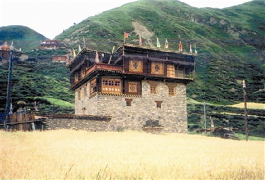 色爾壩藏寨以石頭、泥土、木頭為主要建筑原材料,絕不用水泥、鋼材等現(xiàn)代建材,甚至屋頂也不用瓦片,全部采用泥土,取材十分簡單、方便,然而因為修建全靠人工,工期較長,需要2-4個月或更長時間。當(dāng)?shù)赝诵莞刹控晠s秋告訴筆者,藏寨房屋層數(shù)有較嚴(yán)格的規(guī)定,普遍為3—4層,不少于3層,也不會高于4層,分別象征一個人的頭部、胸部、腹部和腿;底層一般用來關(guān)牲畜或堆放雜物,第二層存貯糧食,第三層居住,第四層設(shè)置佛堂,這種建筑風(fēng)格不同于周邊爐霍、道孚、丹巴民居,自成一體。藏寨造型完全擬人化,外形奇特,上大下小呈倒立的品字形,猶如一個頭戴盔甲、身披戰(zhàn)袍的將軍;房屋上層樓廊外部均以高山柳條垂掛環(huán)繞,以象征大將色爾哇·尼崩達(dá)雅的披肩長發(fā);房頂正中的小旗幟就象將士頭盔上的帽纓;房屋右側(cè)隨風(fēng)飄拂的經(jīng)幡,恰似將軍手握長矛在沖鋒陷陣。房屋依山而建,傍山而立,外形高大雄偉。深厚的格薩爾文化為藏寨蒙上了一層神秘的面紗。