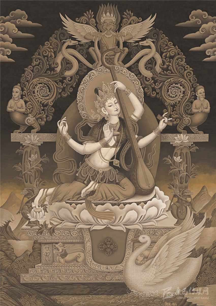 (一)對比色調(diào):畫面顏色干凈,對比強烈,大多用對比色來彰顯力量;施金華麗、燦爛而不泛濫。(二)暗色調(diào):畫面明度較低,常用黑色、藏青、絳紅、深綠來調(diào)劑各類原色,使得畫面色彩沉郁中透露出清新、凝重中綻放出優(yōu)雅,色彩的過渡細膩而豐富。(三)素色調(diào):尼瓦爾唐卡最有特色的就是“素色調(diào)”的唐卡(簡稱“素唐”)。筆者之所以稱其為“素色調(diào)”而不稱作“黑白”或“單色”,是因為畫面雖然沒有明顯的色彩,但是也非單一的黑色或灰色。它不僅調(diào)配了從深到淺的許多色階;還有雅致的黃灰、曠遠的藍灰、宏大的紅灰等諸般色相的交響以及微妙的冷暖搭配,整體呈現(xiàn)出夢幻般的美感。