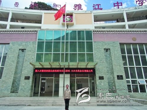 作者在雅江中學(xué)大樓前
