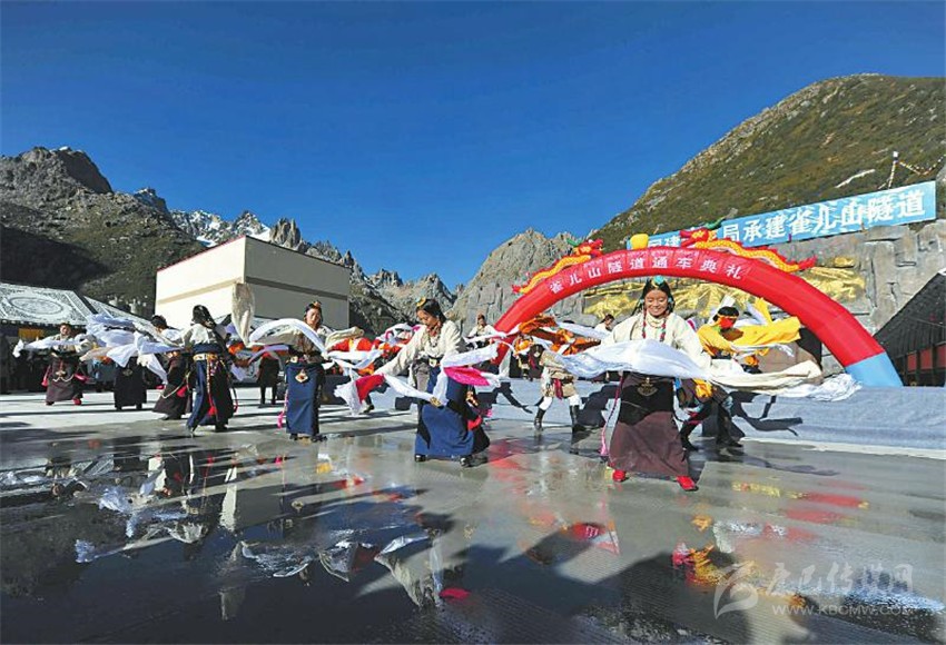 藏族群眾載歌載舞慶祝雀兒山隧道通車。何海洋 攝