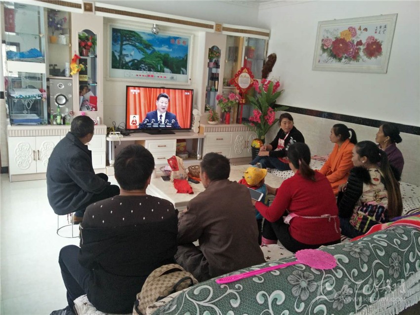 在長(zhǎng)沙貢瑪鄉(xiāng),巴格瑪尼石刻合作社全體社員,通過(guò)便攜式“馬背”電視機(jī)收看開(kāi)幕會(huì)盛況。社員尼澤說(shuō):“國(guó)家提出精準(zhǔn)扶貧政策后,縣委政府千方百計(jì)的幫助我們尋找致富門路,引導(dǎo)我們通過(guò)組建合作社脫貧致富奔康,我們的日子越來(lái)越好,這使我明白了一個(gè)道理,國(guó)家強(qiáng)則民族強(qiáng),真心祝愿祖國(guó)越來(lái)越好。”