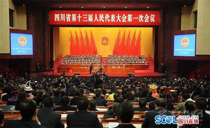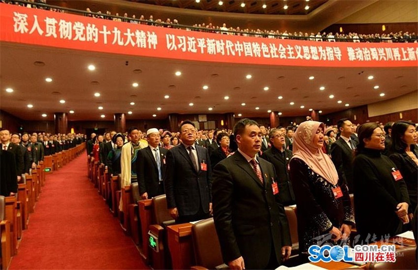 上午10時(shí)許,王東明宣布:四川省第十三屆人民代表大會(huì)第一次會(huì)議開幕。全體起立,雄壯的中華人民共和國(guó)國(guó)歌在會(huì)場(chǎng)內(nèi)唱響。