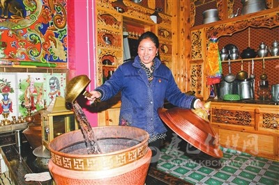 寬敞的院壩,卵石鋪就的花臺花開爭艷,獨立的衛(wèi)生間和廚房里,現(xiàn)代廚衛(wèi)一樣不缺,三個冰柜擺滿了食品,燒烤爐擺在廚房一角。走進(jìn)頂真的客廳,55吋的液晶電視,造型典雅別致的碗柜,琳瑯滿目的各式器皿,藏桌上擺滿了水果和飲料。坐在“豪華”的客廳里,頂真幸福開懷。