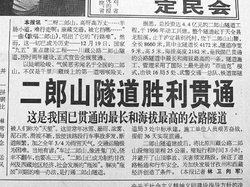 二郎山老路交通瓶頸,影響到甘孜州及西藏地區(qū)經(jīng)濟(jì)社會(huì)發(fā)展。1996年,二郎山隧道開建,歷時(shí)2年,于1998年底貫通?!岸缮剿淼喇?dāng)時(shí)是全國最長、海拔最高、地質(zhì)最復(fù)雜的公路隧道,建設(shè)很不容易。”林衛(wèi)回憶,當(dāng)年采訪建設(shè)二郎山隧道的鐵道部隧道局三處和武警交通一總隊(duì)時(shí),曾聽聞隧道開挖中遇到的各種危險(xiǎn),一名現(xiàn)場指揮長就曾被卷入洪水,所幸后來死里逃生。