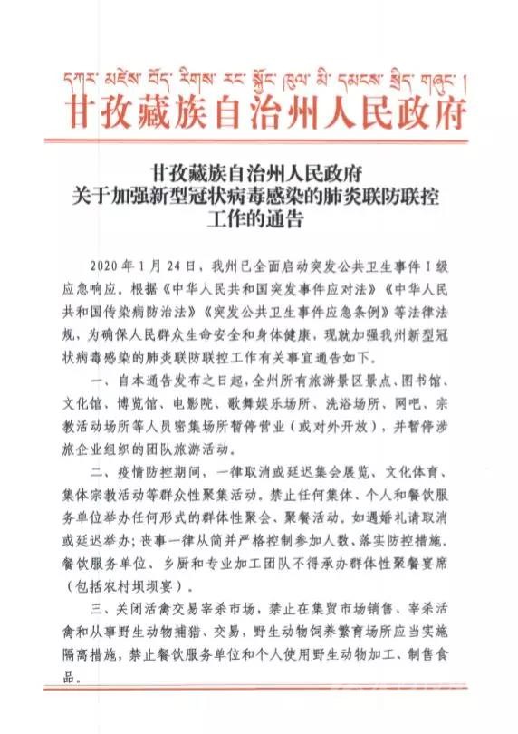 2020年1月24日,我州已全面啟動(dòng)突發(fā)公共衛(wèi)生事件I級(jí)應(yīng)急響應(yīng)。根據(jù)《中華人民共和國(guó)突發(fā)事件應(yīng)對(duì)法》《中華人民共和國(guó)傳染病防治法》《突發(fā)公共衛(wèi)生事件應(yīng)急條例》等法律法規(guī),為確保人民群眾生命安全和身體健康,現(xiàn)就加強(qiáng)我州新型冠狀病毒感染的肺炎聯(lián)防聯(lián)控工作有關(guān)事宜通告如下。一、自本通告發(fā)布之日起,全州所有旅游景區(qū)景點(diǎn)、圖書(shū)館、文化館、博覽館、電影院、歌舞娛樂(lè)場(chǎng)所、洗浴場(chǎng)所、網(wǎng)吧、宗教活動(dòng)場(chǎng)所等人員密集場(chǎng)所暫停營(yíng)業(yè)(或?qū)ν忾_(kāi)放),并暫停涉旅企業(yè)組織的團(tuán)隊(duì)旅游活動(dòng)。二、疫情防控期間,一律取消或延遲集會(huì)展覽、文化體育、集體宗教活動(dòng)等群眾性聚集活動(dòng)。禁止任何集體、個(gè)人和餐飲服務(wù)單位舉辦任何形式的群體性聚會(huì)、聚餐活動(dòng)。如遇婚禮請(qǐng)取消或延遲舉辦;喪事一律從簡(jiǎn)并嚴(yán)格控制參加人數(shù)、落實(shí)防控措施。餐飲服務(wù)單位、鄉(xiāng)廚和專業(yè)加工團(tuán)隊(duì)不得承辦群體性聚餐宴席(包括農(nóng)村壩壩宴)。三、關(guān)閉活禽交易宰殺市場(chǎng),禁止在集貿(mào)市場(chǎng)銷售、宰殺活禽和從事野生動(dòng)物捕獵、交易,野生動(dòng)物飼養(yǎng)繁育場(chǎng)所應(yīng)當(dāng)實(shí)施隔離措施,禁止餐飲服務(wù)單位和個(gè)人使用野生動(dòng)物加工、制售食品。四、嚴(yán)格執(zhí)行政府依法制定的價(jià)格干預(yù)措施和緊急措施,對(duì)假冒偽劣、惡意搶購(gòu)、囤積居奇、哄抬物價(jià)等不法行為依法從嚴(yán)查處。五、廣大社會(huì)公眾要提高警惕,支持并參與愛(ài)國(guó)衛(wèi)生運(yùn)動(dòng),做好個(gè)人防護(hù),搞好居家消毒,減少外出和走親訪友,主動(dòng)報(bào)告涉及疫情傳播隱患的一切線索。1月10日以后,有過(guò)湖北等疫區(qū)旅居史的,請(qǐng)即刻報(bào)告所在地村委會(huì)(社區(qū))登記備案,自返鄉(xiāng)(進(jìn)州)之日起居家隔離觀察14天,并進(jìn)行早晚體溫監(jiān)測(cè)記錄和核驗(yàn);一旦出現(xiàn)發(fā)熱、乏力、呼吸困難、呼吸道感染(干咳為主)等癥狀,請(qǐng)立即佩戴口罩就近到當(dāng)?shù)蒯t(yī)療機(jī)構(gòu)發(fā)熱門診就診。六、州域內(nèi)所有單位和個(gè)人,必須接受衛(wèi)生行政主管部門或有關(guān)機(jī)構(gòu)的傳染病調(diào)查檢測(cè)、采集樣本等預(yù)防措施;病人、疑似病人和傳染病病人密切接觸者應(yīng)當(dāng)積極配合接受隔離治療、醫(yī)學(xué)觀察等控制措施,并如實(shí)提供有關(guān)情況。對(duì)拒絕配合的,公安機(jī)關(guān)將依法協(xié)助強(qiáng)制執(zhí)行;對(duì)妨害執(zhí)行公務(wù)的,公安機(jī)關(guān)將依法從嚴(yán)從重處理。七、嚴(yán)禁任何單位和個(gè)人發(fā)布不實(shí)信息,對(duì)有造謠、傳謠等違法行為的,公安機(jī)關(guān)將依法嚴(yán)厲查處。本通告自發(fā)布之日起施行,終止日期另行通告。