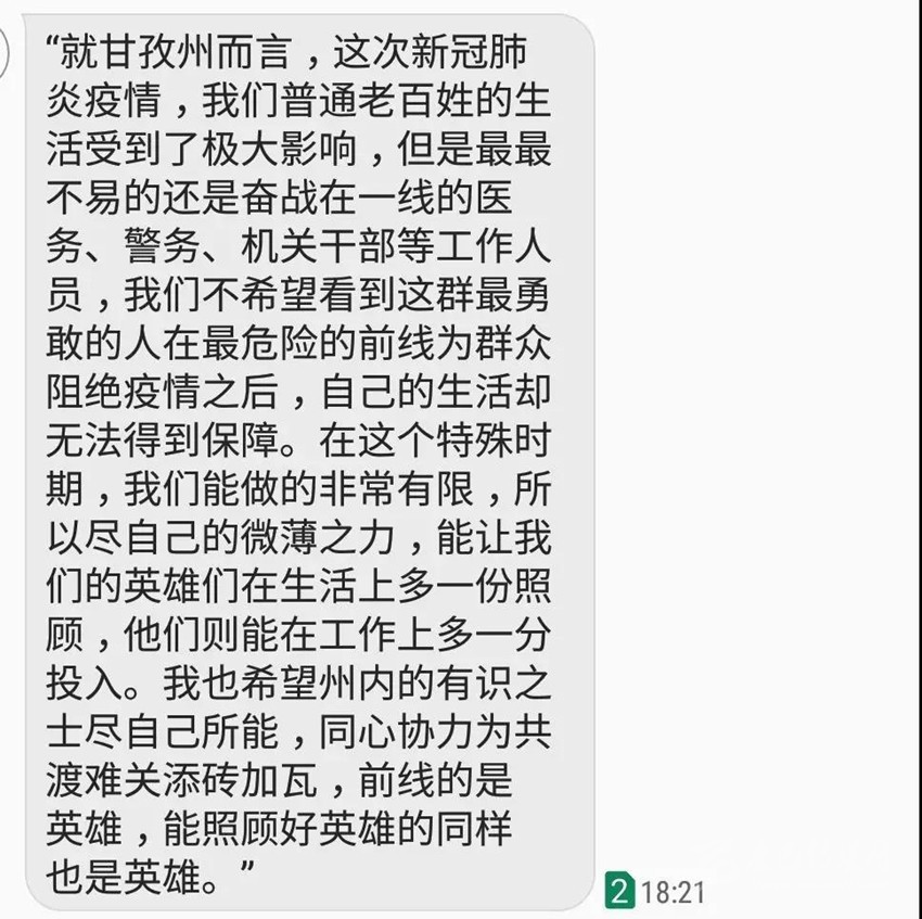 加勇一邊從兜里拿出1000元往鄉(xiāng)干部手中遞,一邊說到:“這個是我跟我兒子捐給國家的,錢不多,我們兩人一個人500,麻煩你們鄉(xiāng)上幫到捐一下。以前,我在擔任村干部期間,國家給了我和家人很多關(guān)懷和照顧,現(xiàn)在我們?nèi)袊荚邶R心協(xié)力防治新型冠狀病毒感染的肺炎疫情,作為一個老黨員,還是原來的村支部書記,我們一家人想為國家盡點力,這個錢不多,但是我想能有捐一點算一點嘛。”