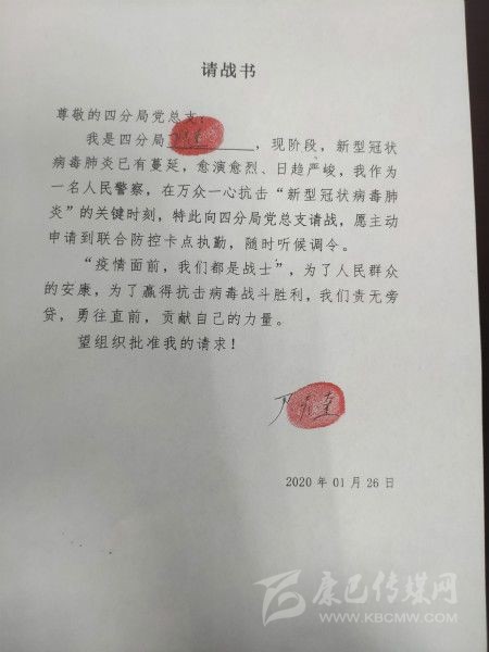 四川新聞網(wǎng)成都1月31日訊(記者 文驥 攝影報(bào)道) “疫情面前,我們都是戰(zhàn)士,為了人民群眾的安康,為了贏得抗擊病毒戰(zhàn)斗勝利,我們責(zé)無旁貸……”尹彥奎是成都交警四分局的一名黨員交警,1月26日,他向分局黨總支遞交了一份請戰(zhàn)書,還按上了手印。