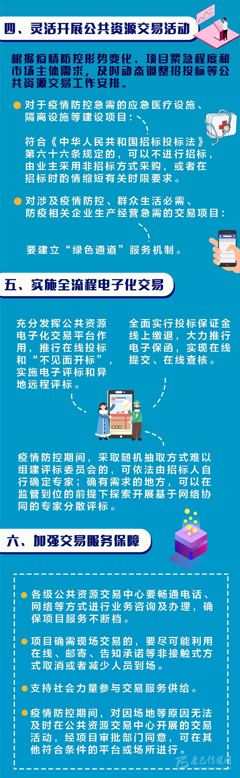 答:近年來,我省按照國家和省委省政府安排部署持續(xù)推進(jìn)公共資源交易全流程電子化,取得了顯著成效。在疫情防控的特殊時(shí)期,更要充分發(fā)揮公共資源電子化交易平臺(tái)作用,推行在線投標(biāo)和“不見面開標(biāo)”,實(shí)施電子評(píng)標(biāo)和異地遠(yuǎn)程評(píng)標(biāo)。同時(shí),全面實(shí)行投標(biāo)保證金線上繳退,大力推行電子保函,實(shí)現(xiàn)在線提交、在線查核。疫情防控期間,采取隨機(jī)抽取方式難以組建評(píng)標(biāo)委員會(huì)的,可依法由招標(biāo)人自行確定專家;確有需求的地方,可在監(jiān)管到位的前提下探索開展基于網(wǎng)絡(luò)協(xié)同的專家分散評(píng)標(biāo)。