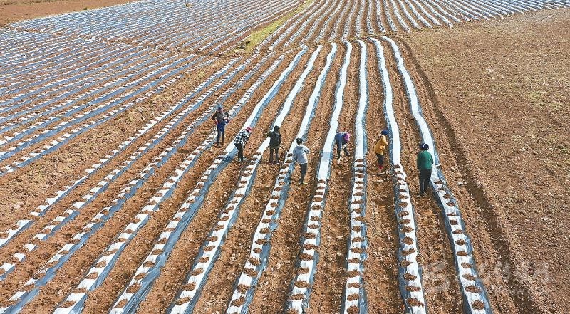 圖為在越西縣新民鎮(zhèn)大寨村,村民正在點(diǎn)種經(jīng)濟(jì)作物烤煙。