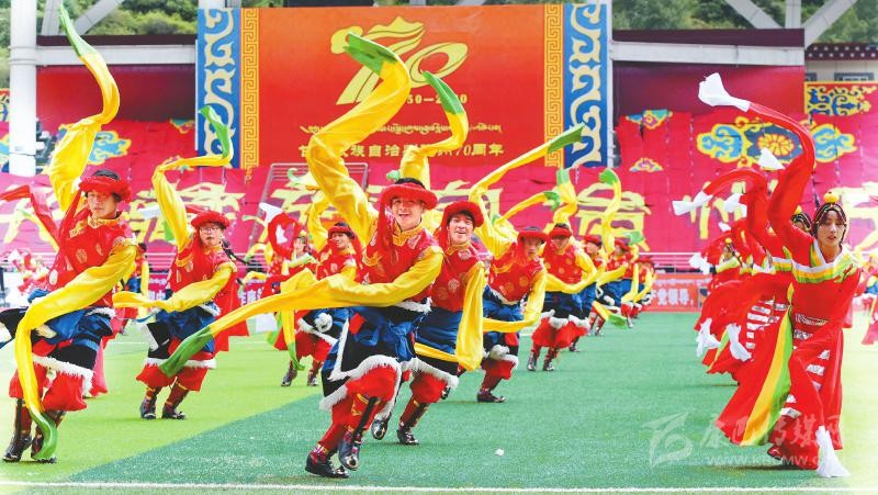 9月17日,甘孜藏族自治州成立70周年慶祝大會(huì)在康定舉行。各族群眾表演以“圣潔甘孜筑夢(mèng)新時(shí)代”為主題的文藝節(jié)目。四川日?qǐng)?bào)全媒體記者 歐陽(yáng)杰 攝