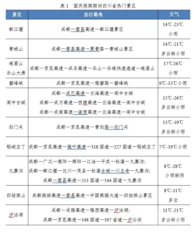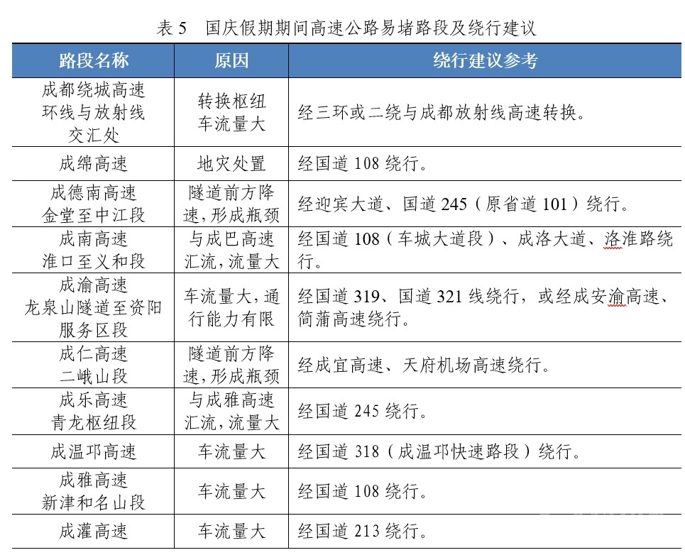 國(guó)慶大假即將來(lái)臨,去哪里?堵不堵?是公眾關(guān)心的熱點(diǎn)。9月28日,四川省交通運(yùn)輸綜合行政執(zhí)法總隊(duì)(廳高管局)、四川省公安廳交通警察總隊(duì)聯(lián)合發(fā)布假期高速公路研判,提醒廣大車主朋友們出行前合理安排出行時(shí)間和出行路線,盡量避開(kāi)高峰時(shí)段和擁堵路段。