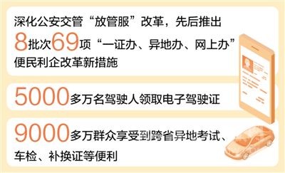 今年12月2日是第十個(gè)“全國交通安全日”,最新數(shù)據(jù)顯示,我國機(jī)動車和駕駛?cè)藬?shù)量持續(xù)增長,目前機(jī)動車保有量已達(dá)3.93億輛,駕駛?cè)诉_(dá)4.79億人。面對道路交通大發(fā)展的新形勢、人民群眾日益增長的新需求,公安部不斷深化公安交管“放管服”改革,先后推出8批次69項(xiàng)“一證辦、異地辦、網(wǎng)上辦”便民利企改革新措施,為群眾和企業(yè)減少辦事成本800多億元。